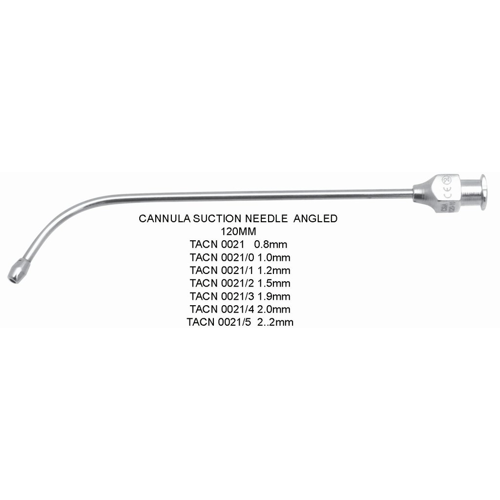 The cannula suction needle angled is a professional surgical instrument designed for controlled fluid aspiration in confined or complex anatomical sites. With a length of 120mm and outer diameters ranging from 0.8mm to 2.2mm, this angled suction cannula allows surgeons to access difficult-to-reach areas while maintaining precise control and minimizing tissue trauma. It is suitable for ENT, dental, orthopedic, and plastic surgical procedures requiring reliable suction performance.